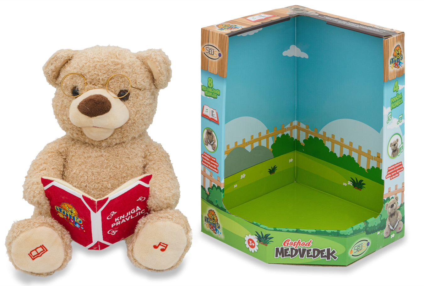Gospod Medvedek je interaktivna plišasta igrača, ki otrokom bere pravljice in jih popelje v svet domišljije. V tačkah drži knjigo pravljic in s pritiskom na gumb začne pripovedovati zgodbe ter predvajati melodije. Opremljen je z očali in prijaznim izrazom, kar mu daje še večjo simpatičnost. Vsebuje 8 različnih pravljic in 4 glasbene melodije, ki zabavajo in hkrati spodbujajo otroško domišljijo ter poslušanje. Zaradi mehkega pliša je primeren tudi za crkljanje, hkrati pa je poučen in zabaven spremljevalec za otroke. Velikost: približno 30 cm Starost: 3+ Opozorilo: Pred uporabo odstranite embalažo in jo shranite za morebitno kasnejšo uporabo.